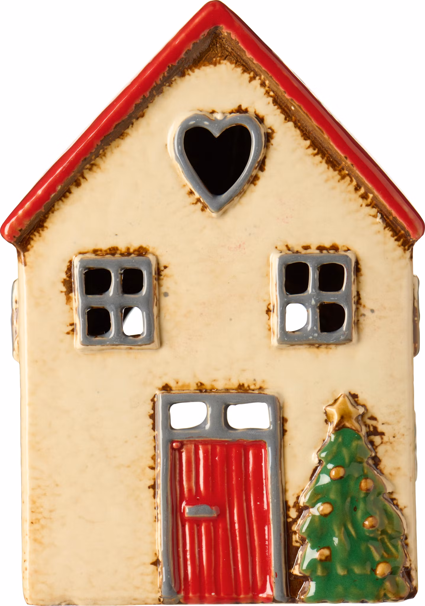 Litet vitt keramikhus med röd dörr och julgran avsett för värmeljus ca 10x7,5x14