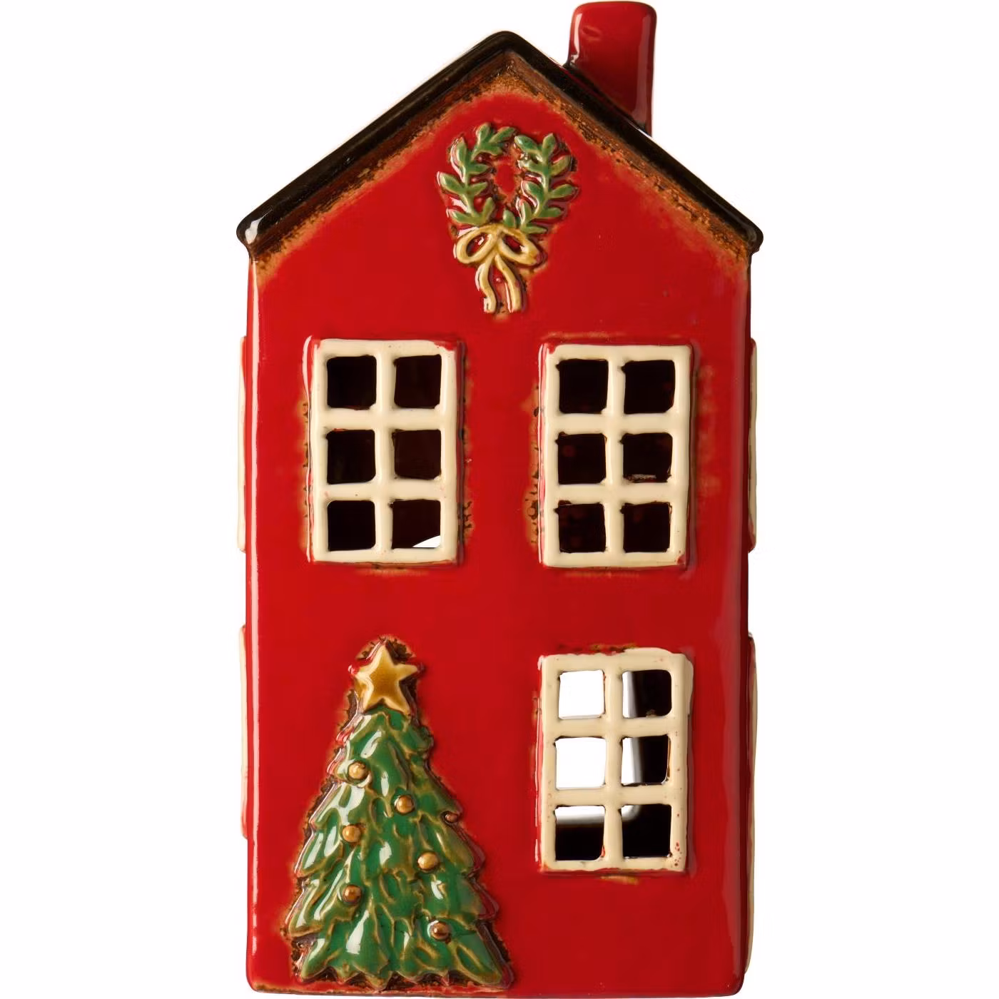 Underbart keramikhus med klädd julgran framför och julkrans i nocken. För värmeljus eller ljusslinga. Skapa julstämning med våra populära keramikhus, där ljus från värmeljus eller en ljusslinga lyser mysigt genom de små fönstren. Bränningen av glasyren ger varje hus ett unikt och livfullt uttryck. Perfekt på egen hand eller som en liten julby.