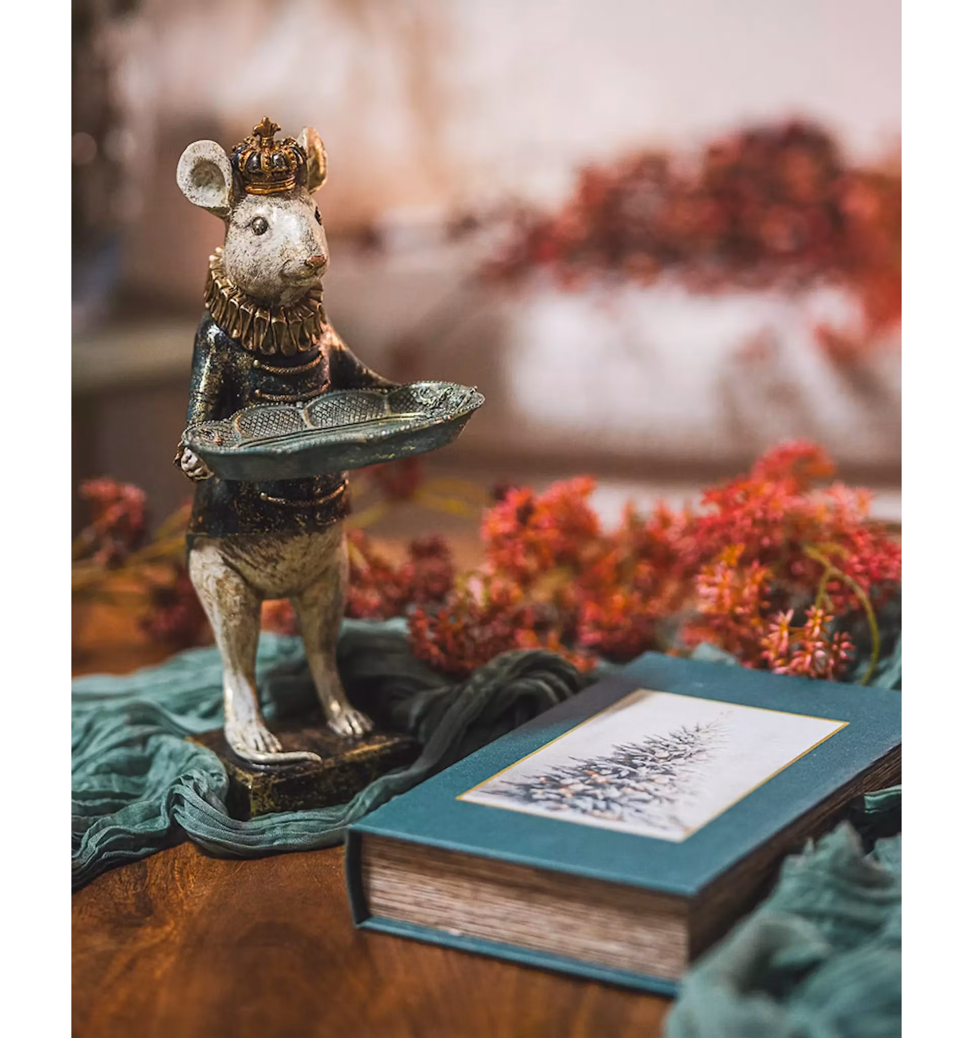 Denna mus med krona som håller i en bricka är en fin dekoration som du kan ha på ett soffbord eller en bänk i vardagsrummet. Tillverkad av poly.storlek 15x32 cm