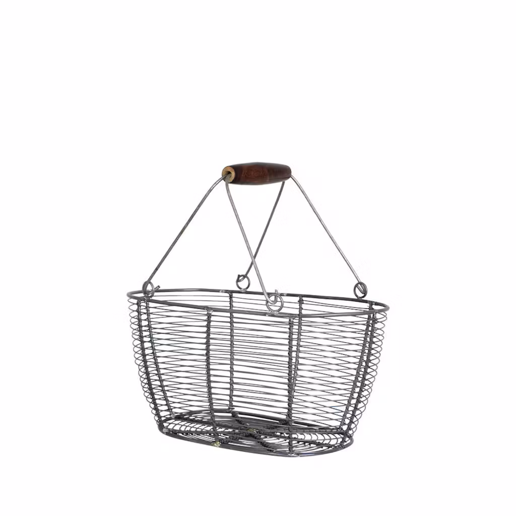 Liten oval trådkorg i zink med trähandtag. Perfekt förvaring i kök eller badrum. Handtagen går att ta loss.Storlek: W 18 x L 30 x H 15 cm