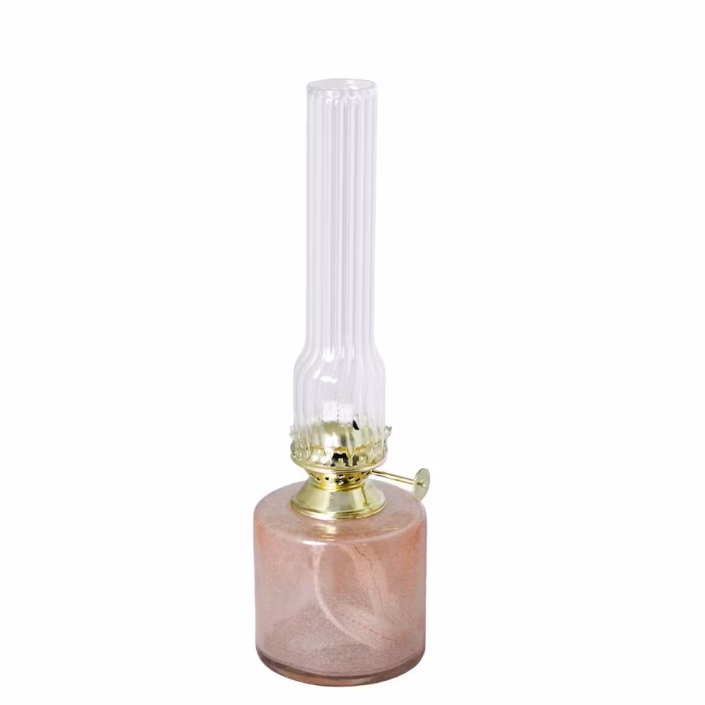 Elegant fotogenlampa i vackert rosa räfflat glas och mässingsbrännare, inklusive en veke. Lampan är tillverkad av 50-60% återvunnet glas och passar me