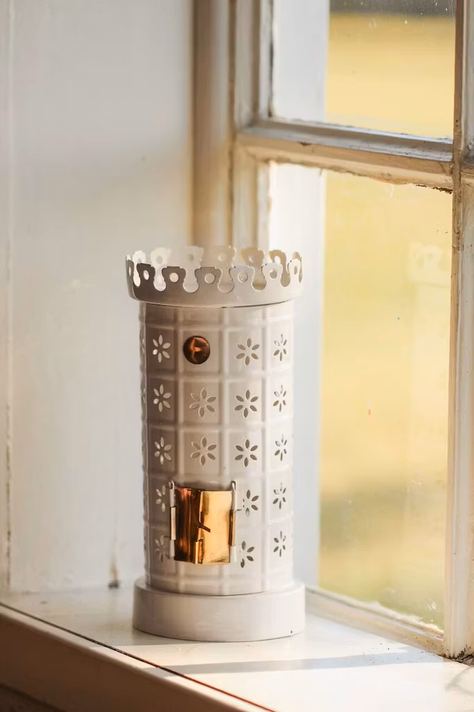 Vacker värmeljushållare i plåt med design inspirerad av en Storlek: Ø 9,5 x H 21 cmklassisk kakelugn i miniformat. Den krämvita ytan och de perforerade par