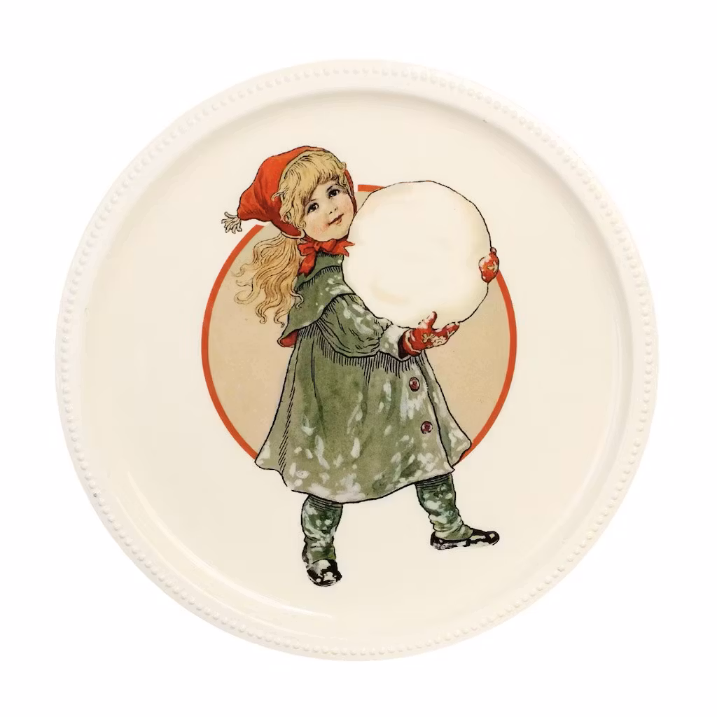 Rund bricka med beige bottenfärg och ett charmigt julmotiv föreställande en flicka som håller en snöboll. Motivet är skapat av Jenny Nyström, en av Sveriges mest älskade illustratörer, känd för sina klassiska jultomtar och stämningsfulla vinterbilder som präglat den svenska jultraditionen sedan slutet av 1800-talet.