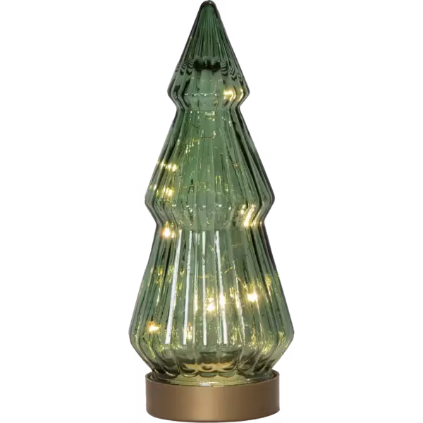 Snygg batteridriven bordsdekoration i form av en gran i transparent mörkt grönt glas. Guldfärgad bas som gömmer batteriboxen. Drivs av 3 st AAA batterier. Ger e