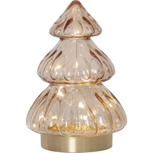 Snygg bordsdekoration i form av en gran i transparent beige glas. Guldfärgad bas som gömmer batteriboxen. Drivs av 3 st AAA batterier. Perfekt till dekoration p
