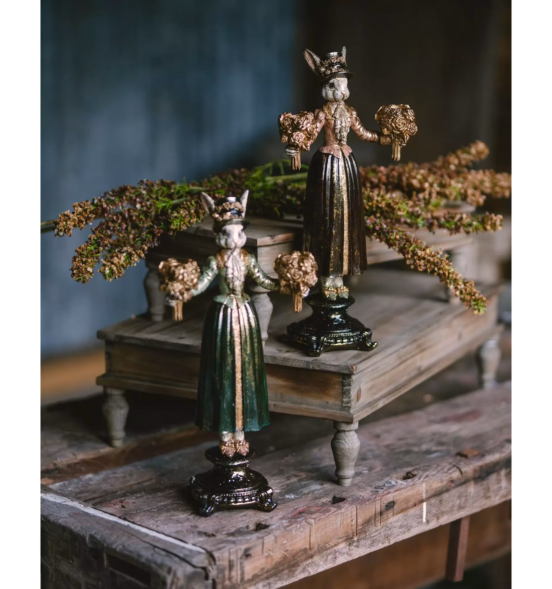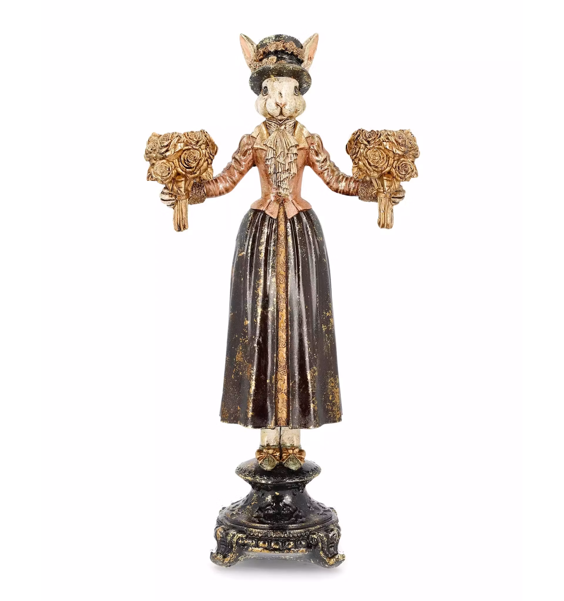 Kanin i klänning som håller två buketter i händerna där ljushållarna finns. Perfekt som påskdekoration. Tillverkad i poly. 19x11x43cm