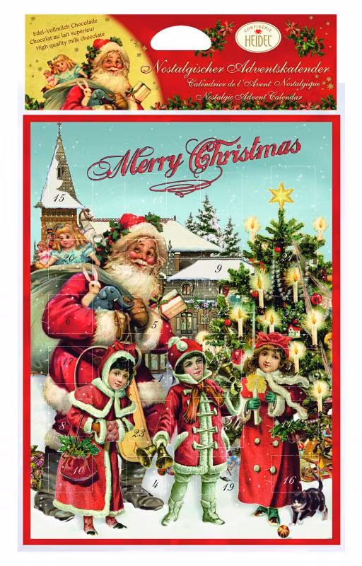 Fin kalender med tomtemotiv från Heidel 79gIngredienser: socker, kakaosmör, helmjölkpulver, kakaomassa, emulgeringsmedel: sojalecitin. Kan innehålla spår av nöt