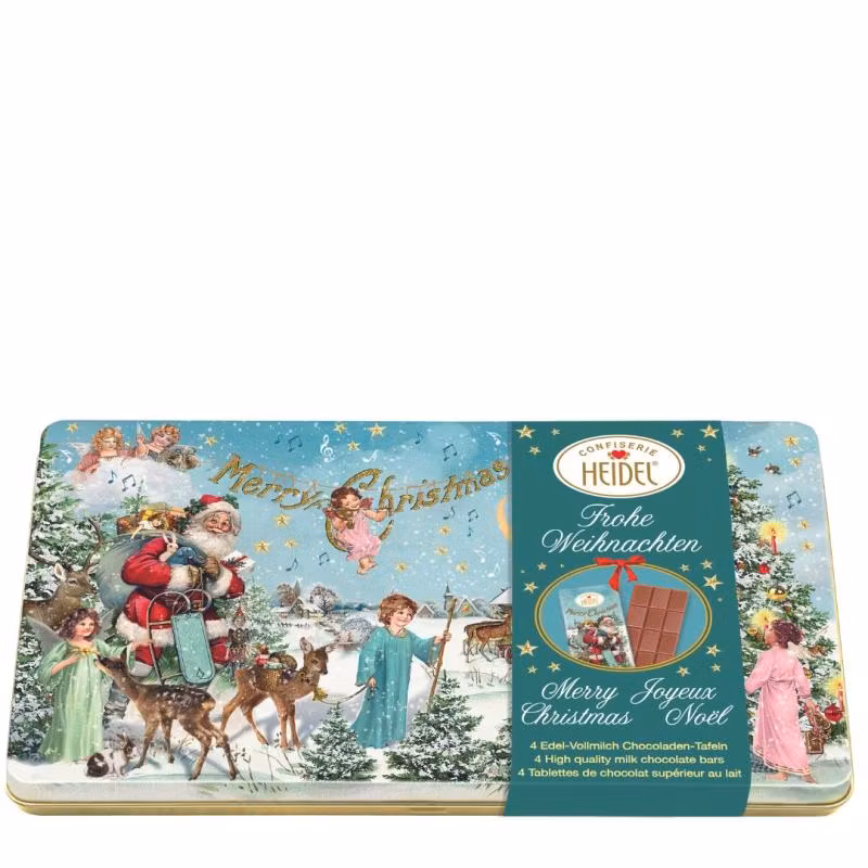 Härligt god mjölkchoklad - vilken underbar julgåva att ge bort! Dessa chokladkakor ligger i en plåtask med fint tecknat nostalgisk motiv, som man gärna sparar långt efter julen.