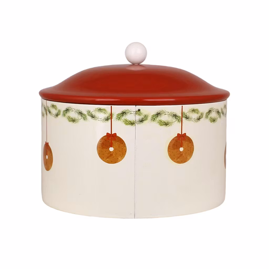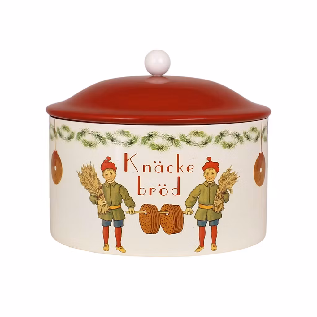 Stor plåtburk med nostalgiskt julmotiv för knäckebröd. Lock i rött med en rund knopp. Silikonring som gör att locket sitter stadigt och sluter tätt. Praktisk fö
