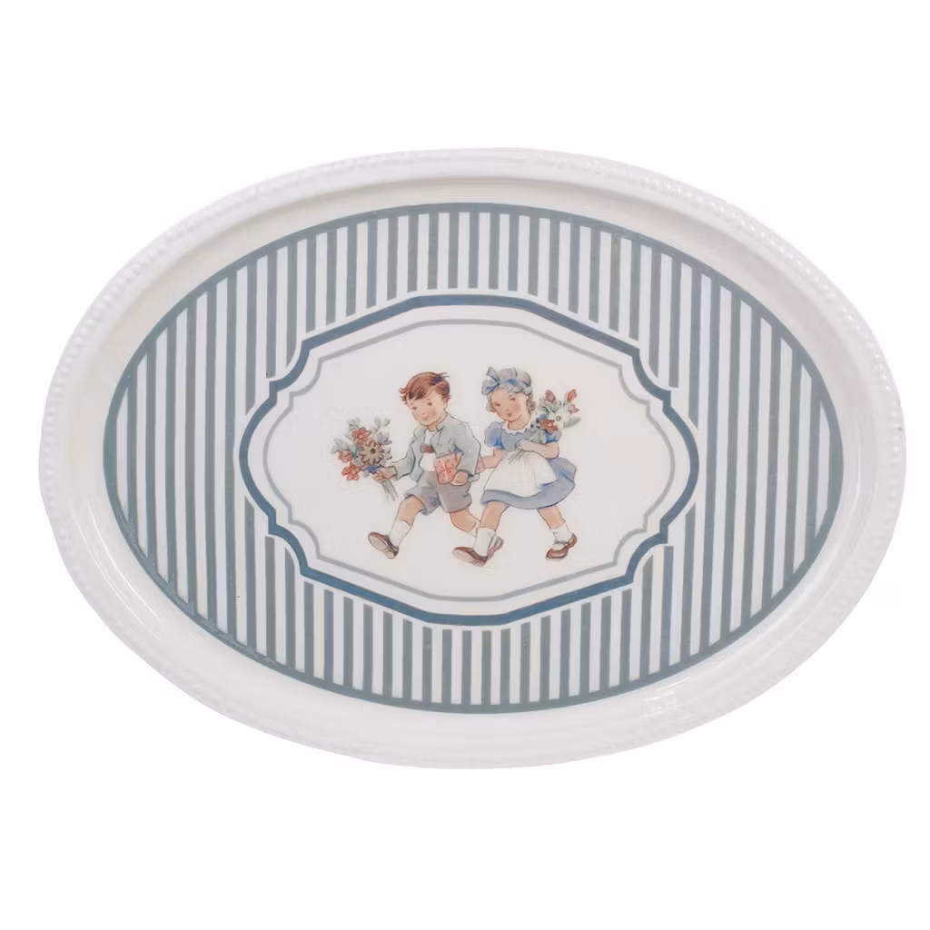 Oval bricka i off-white med blåa ränder och ett charmigt motiv av två barn som håller i varsin blombukett. Brickan är tillverkad av slitstarkt material med en s
