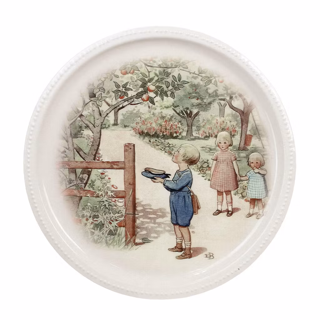 Rund bricka i off-white med ett charmigt motiv av en pojke i en äppelund. Konstverket är av Elsa Beskow, en av Sveriges mest älskade illustratörer och barnboksförfattare.