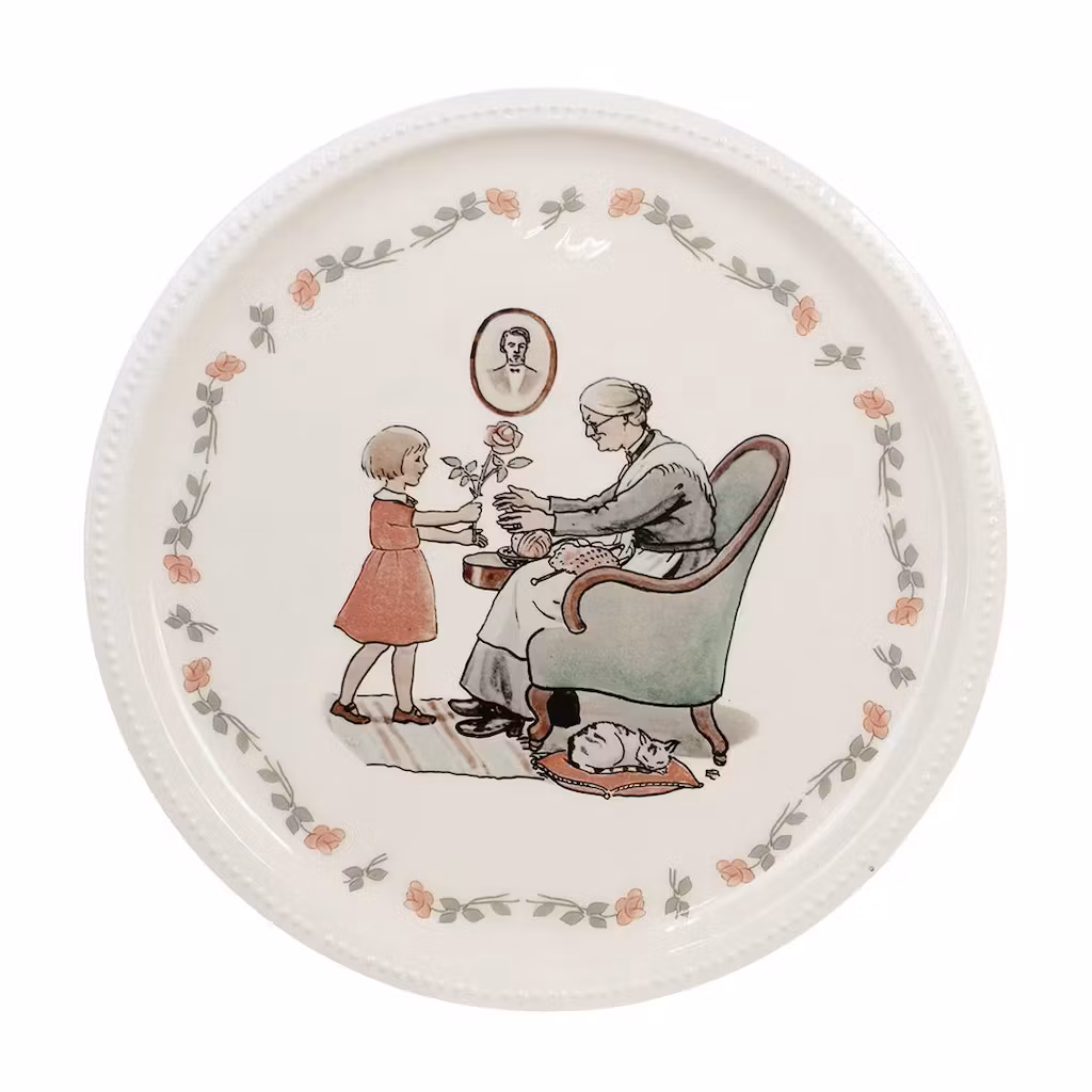 Rund bricka i off-white med ett charmigt motiv av en flicka som ger en ros till en gumma i en stol. Konstverket är av Elsa Beskow, en av Sveriges mest älskade illustratörer och barnboksförfattare. Ø30cm Brickan är tillverkad av slitstarkt material med en slät, lättavtorkad yta. Kan torkas av med en fuktig trasa.