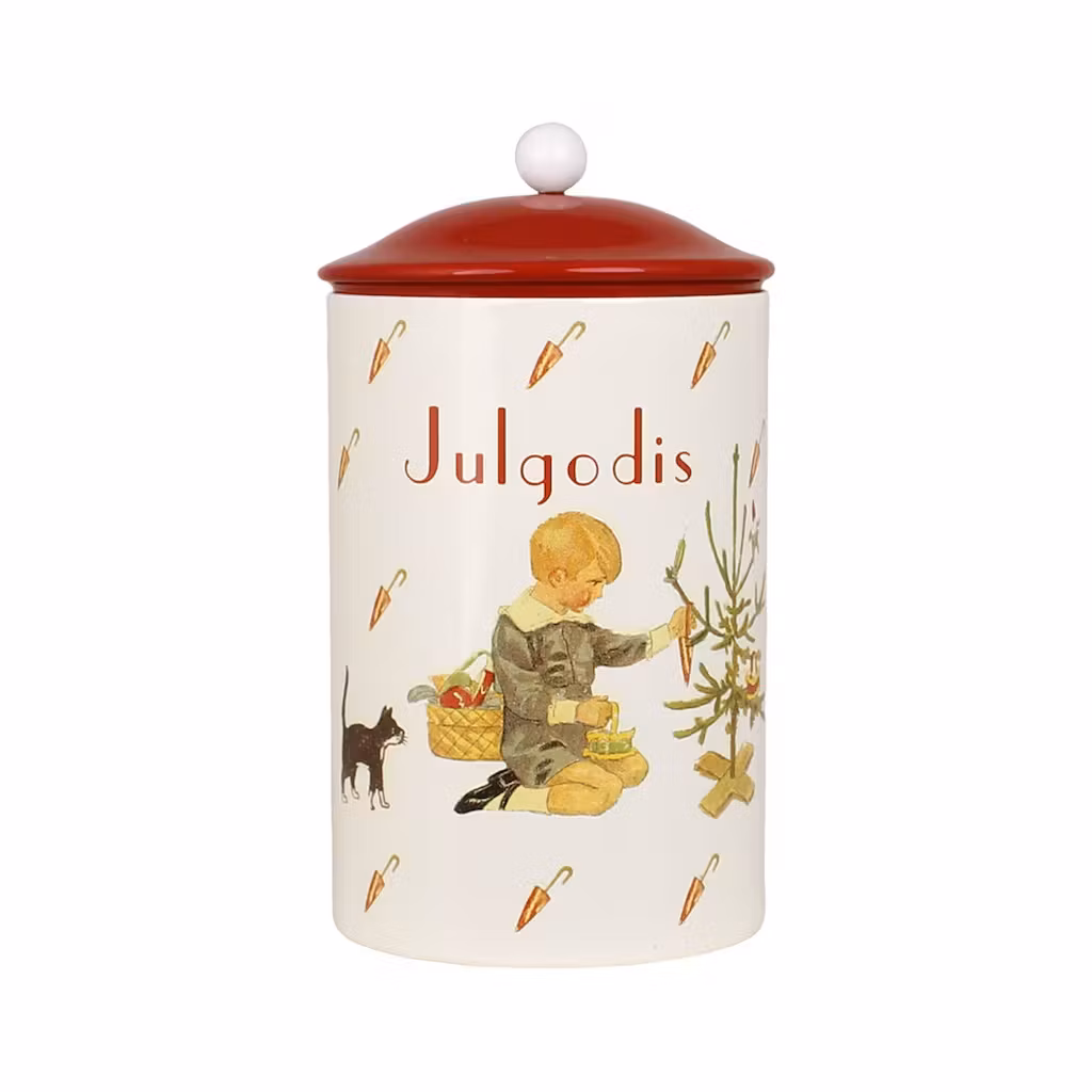 Plåtburk med nostalgiskt julmotiv för julgodis. Lock i rött med en rund knopp. Silikonring som gör att locket sitter stadigt och sluter tätt. Plåtburkarna