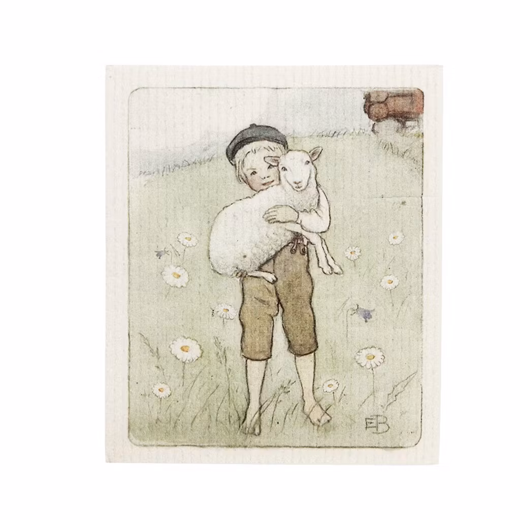Klassisk, svensktillverkad wettextrasa i 70 % cellulosa och 30 % bomull, med ett charmigt motiv av en pojke som håller ett lamm. Konstverket är av Elsa Beskow, en av Sveriges mest älskade illustratörer och barnboksförfattare.