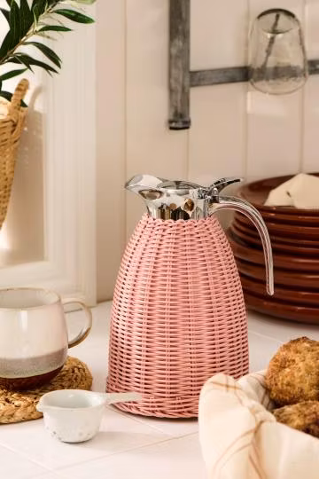 En fin retrokanna i rostfritt stål med flätad rotting i polyplast. Kannan rymmer 1,5 l
