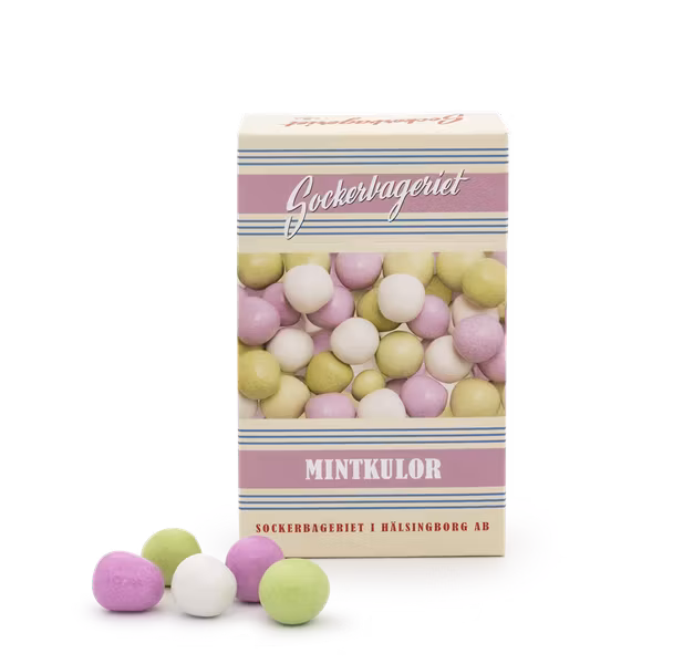 Klassiska mintkulor med ett knaprigt yttre med mjuk mintfyllningIngredienserSocker, kakaomassa, glukossirap, kakaosmör, risstärkelse, förtjockningsmedel (gummi