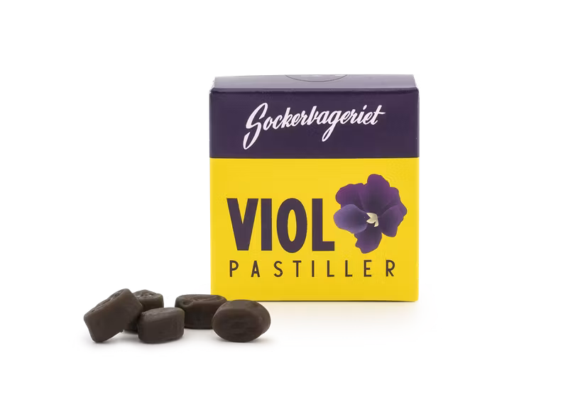 Nostalgi i en tablettask! Mjuka och sega pastiller med geniun violsmak.IngredienserSocker, vatten, invertsockersirap, glukossirap, stärkelse, modifierad stärkel