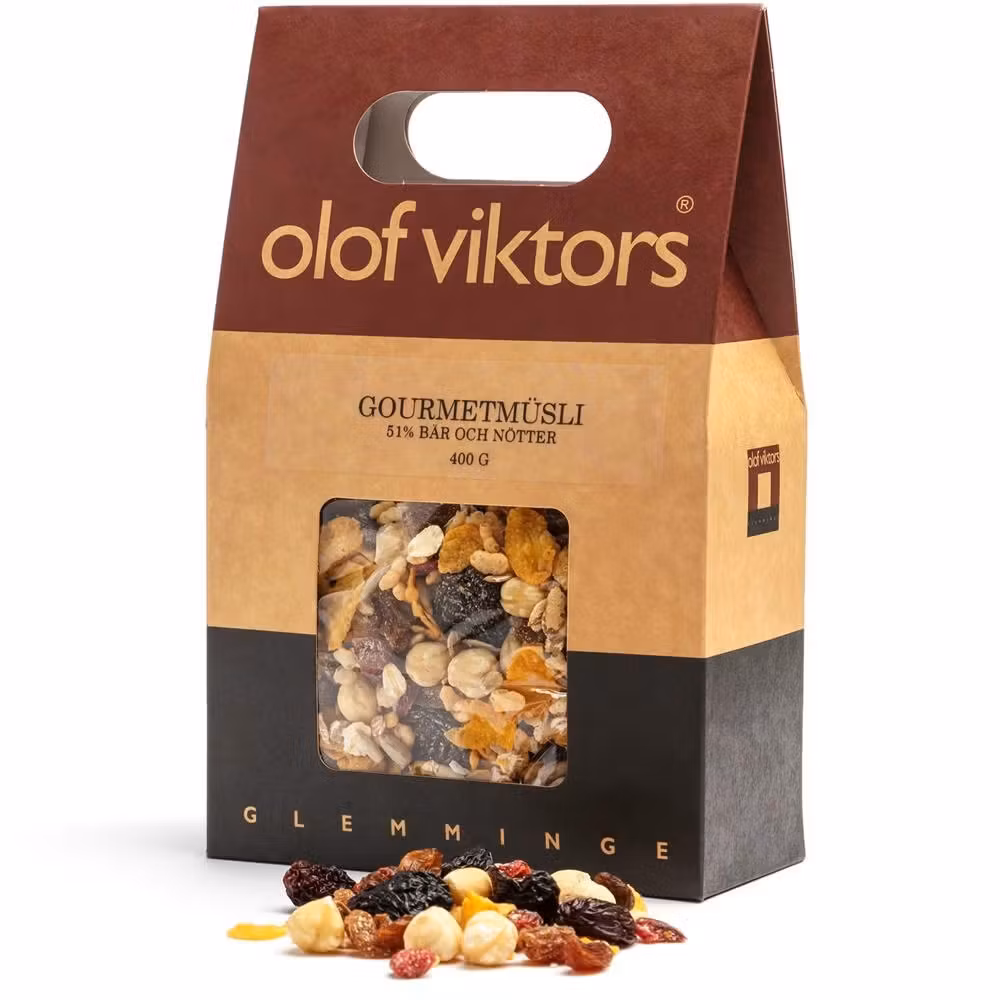 Olof Viktors müsli görs varsamt för hand i små batcher. Olof Viktors Gourmetmüsli Innehåller 51% bär och nötter och är en av våra mest populära produkter. Gourmetmüslin passar utmärkt till frukost för att få en bra start på dagen såväl som till mellanmål. På Olof Viktors gör vi allt för hand från grunden med endast naturliga råvaror. Sedan 2002 har vi erbjudit våra kunder hantverksprodukter från Österlen av högsta kvalitet. Tid och bra råvaror är de viktigaste ingredienserna för att skapa en god produkt - vi på Olof Viktors använder mycket av båda.