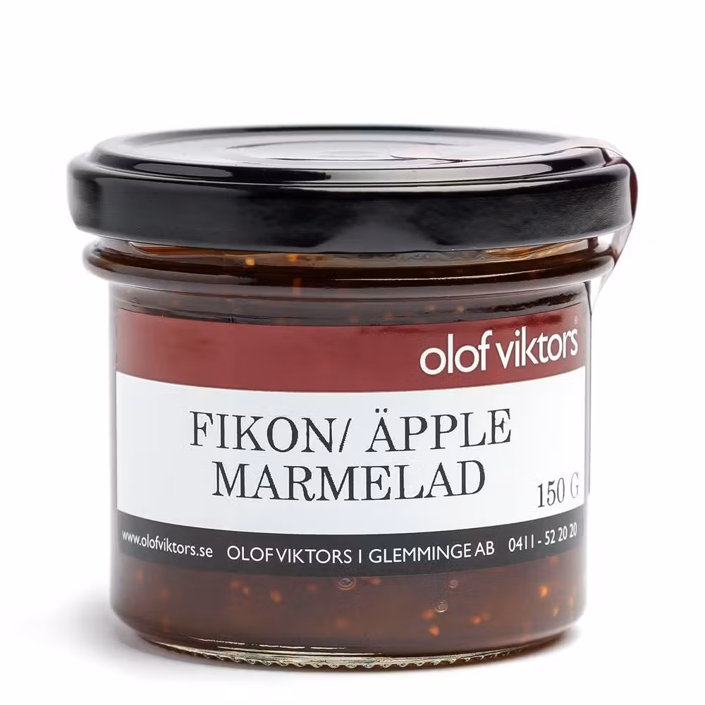 Olof Viktors marmelader kokas varsamt för hand i små batcher över öppen låga i koppargrytor för att få en så bra produkt som möjligt. Olof Viktors Fikon / Äpplemarmelad passar utmärkt till bland annat frukostmackan, terriner/pasterjer och till ostbrickan