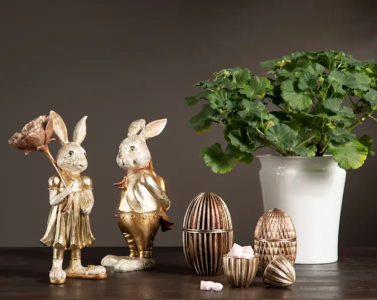 Super fin kaninflicka som håller i en blomma i guldfärger , flickan är tillverkad i poly och är 18x12x31cm.