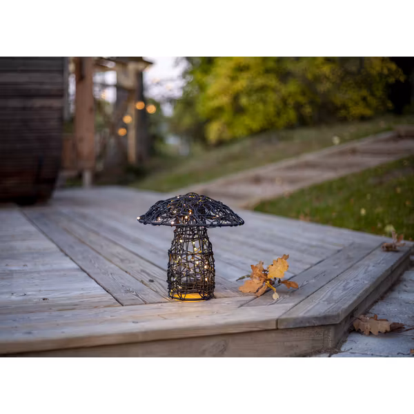 Batteridriven utomhusdekoration i form av en svamp, 26 cm hög. Av svart konstrotting med metallstomme. Lampskärmen är handflätad vilket ger varje produkt ett unikt utseende. Batteridosan drivs med 3 st AA batterier och har praktisk timerfunktion. En fin dekoration för uteplatsen och trädgården.